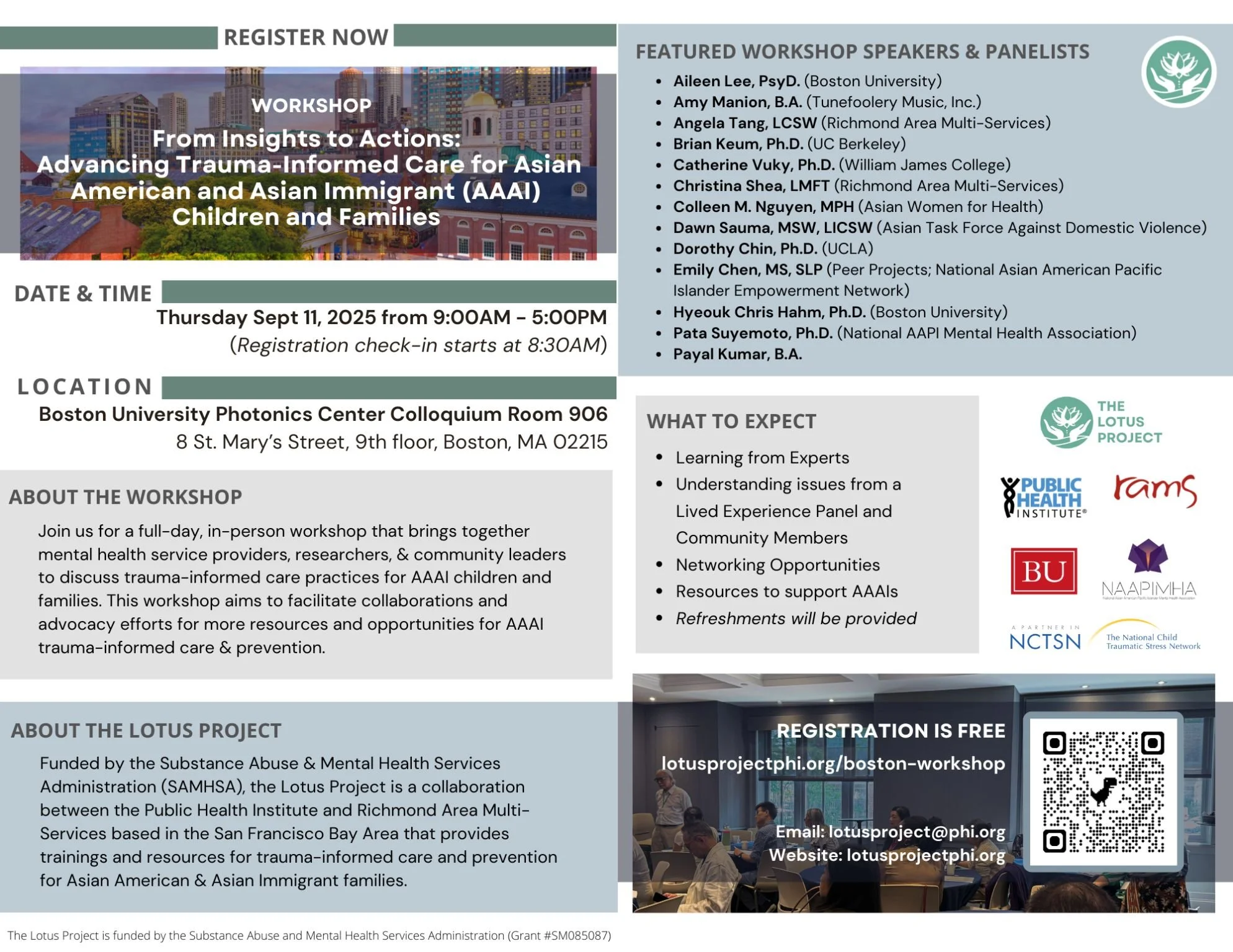 This in-person workshop will highlight current mental health needs among AAAI children and families in the Greater Boston area, discussing relevant findings from AAAI-focused mental health research and interventions related to culturally responsive clinical practices.